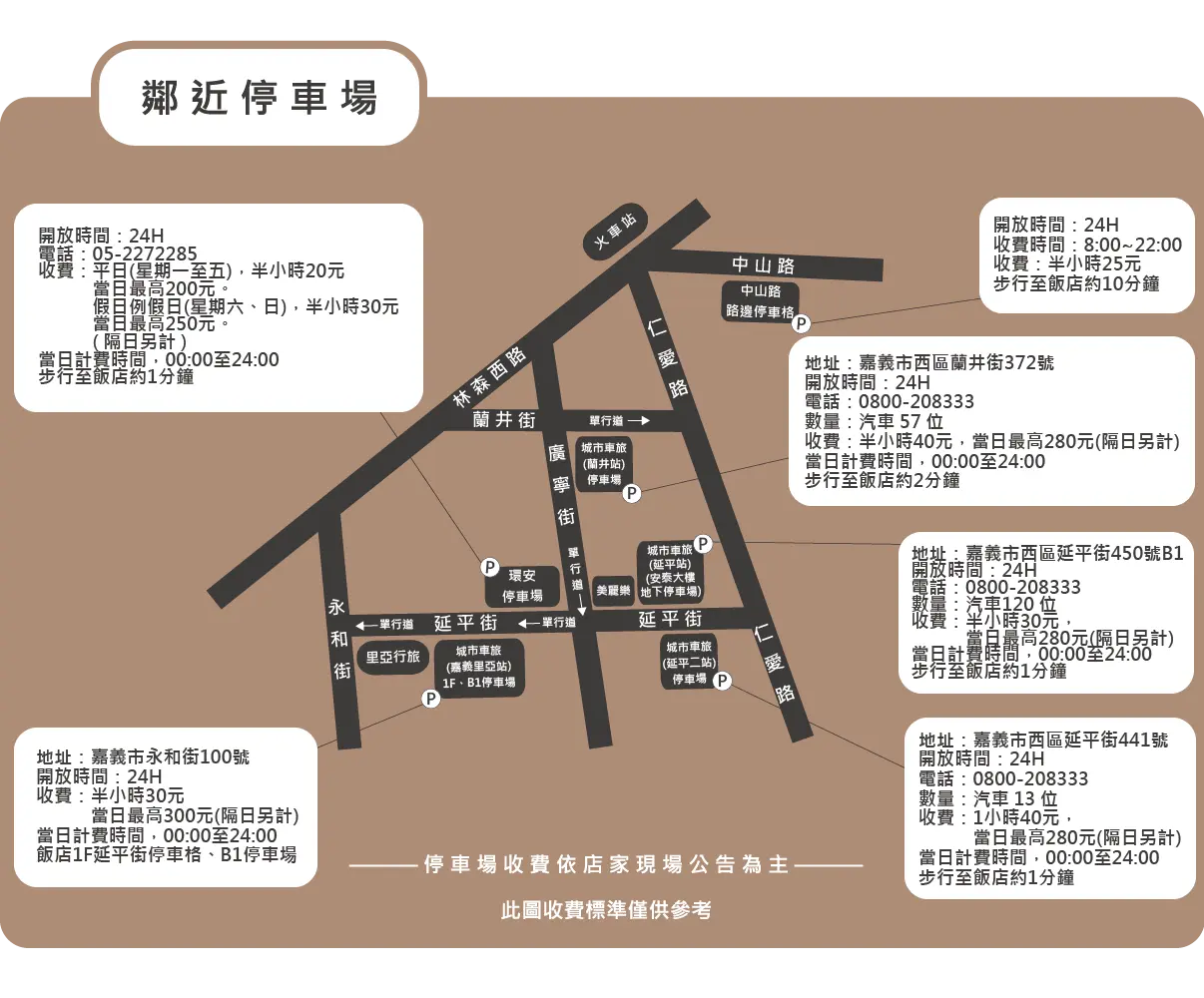- 櫃檯可協助指引至鄰近停車場(費率依各停車場公告為準)。