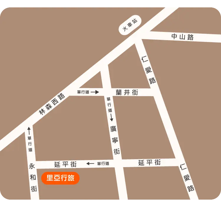 - 里亞行旅附近行車建議路線 (單行道):林森西路 → 蘭井街 → 廣寧街 → 延平街右轉。